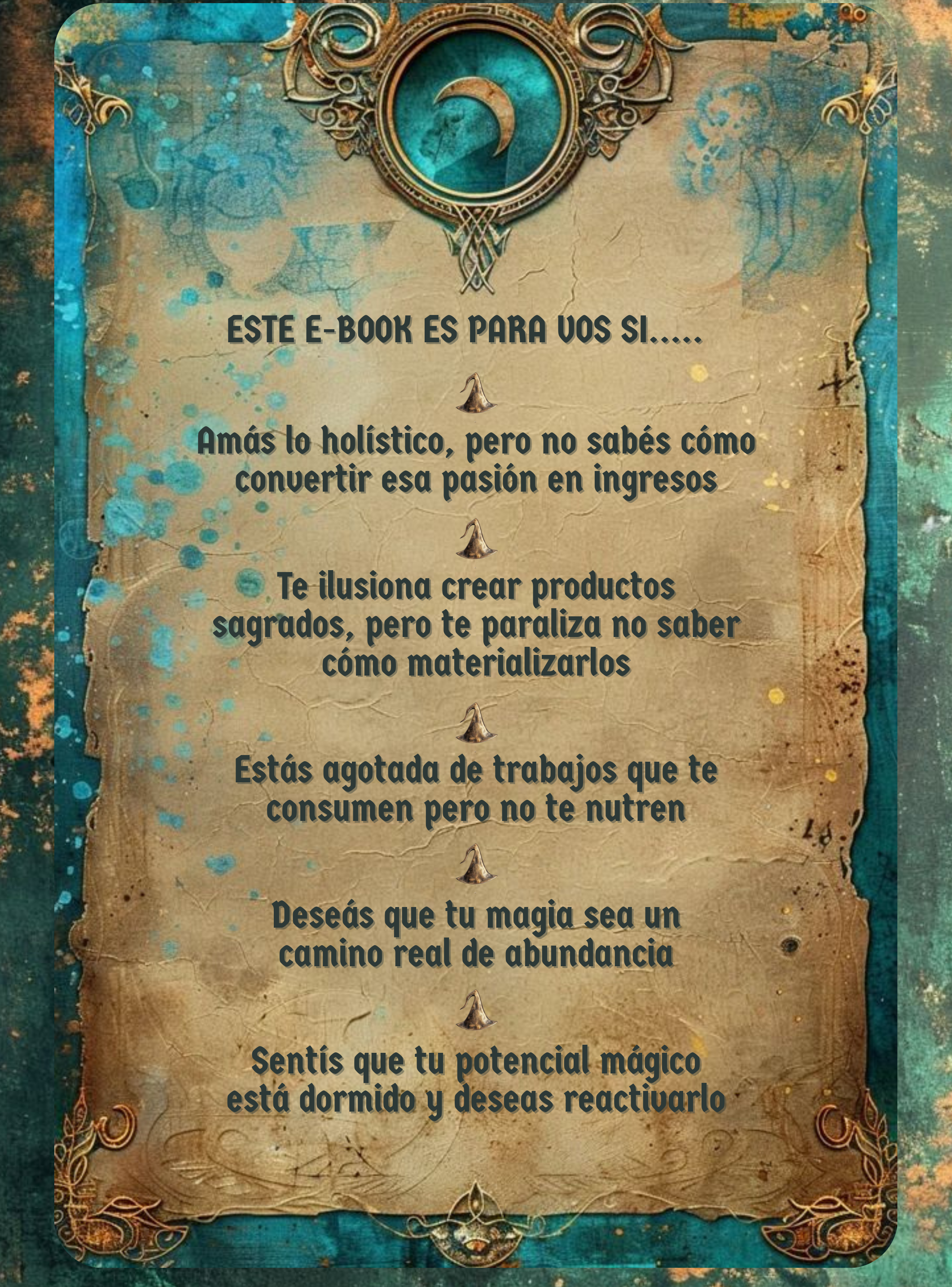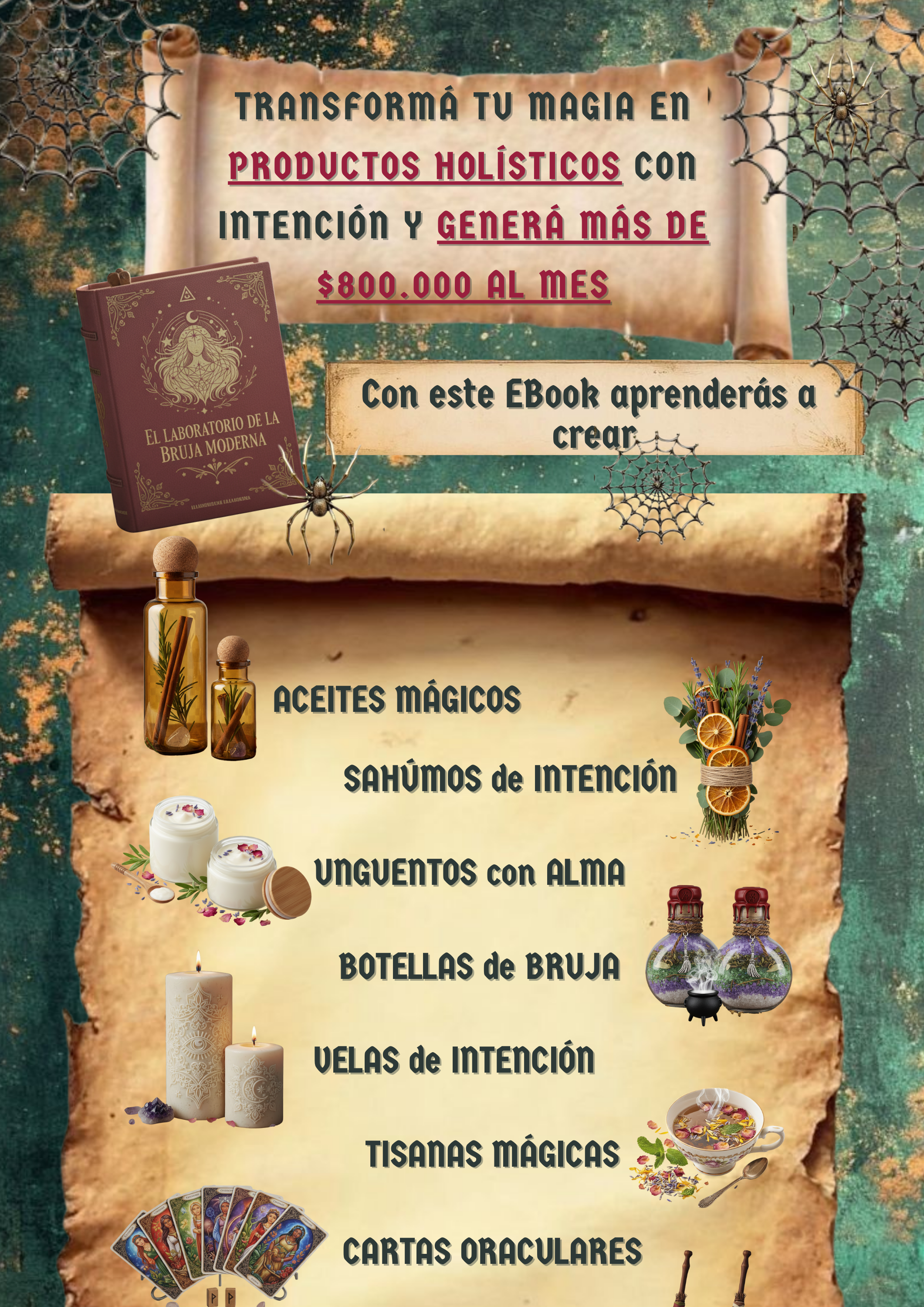 El Laboratorio de la Bruja Moderna es una guía completa donde aprendés a crear tus propias artesanías holísticas desde cero —velas rituales, tisanas mágicas, botellas de Bruja, sahúmos, sigilos, amuletos y más— entendiendo la energía, la intención y el ritual detrás de cada creación.